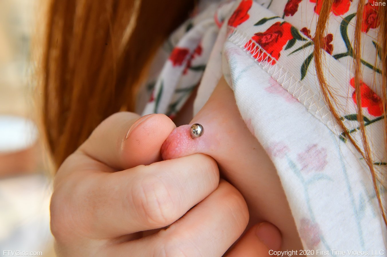 New ginger FTVGirls model Jane Rogers in denim shorts exposing her nude very pretty pink privates outdoors in Naughty Modeling