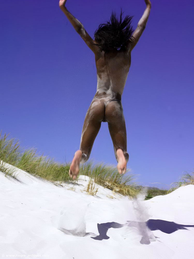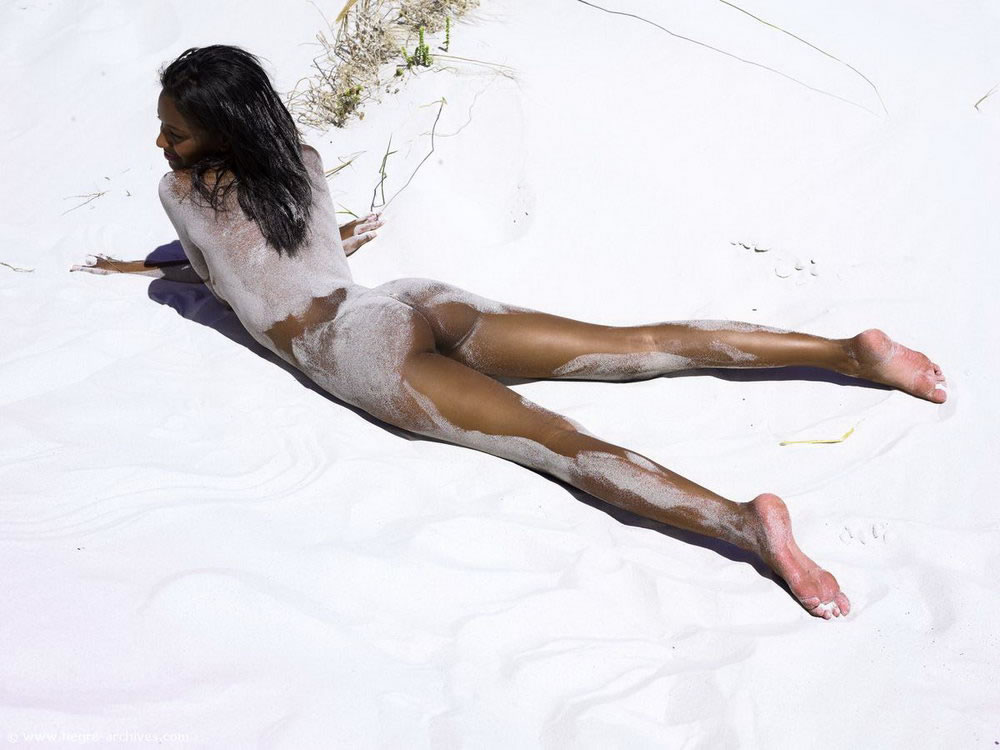 Skinny black Hegre Art model Naomi poses naked on beach in White Sands