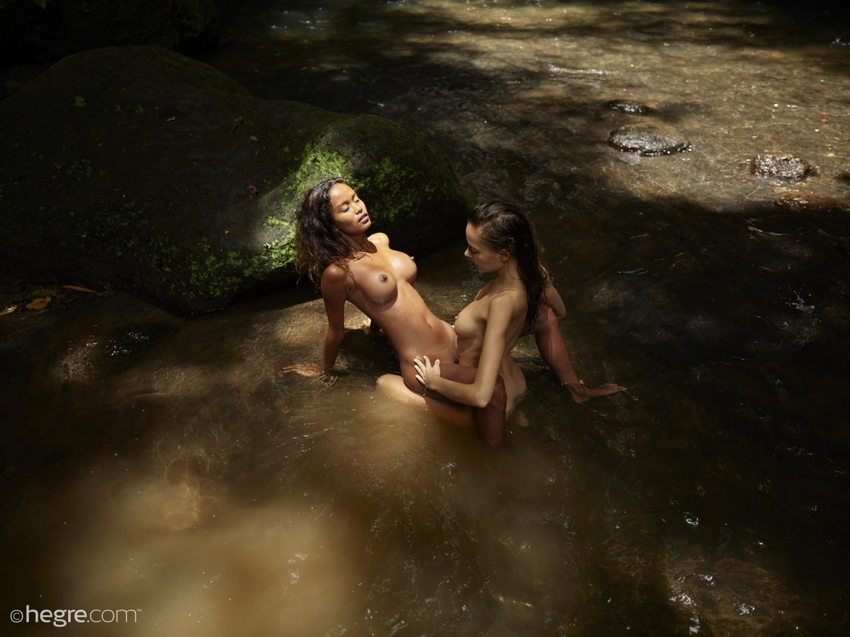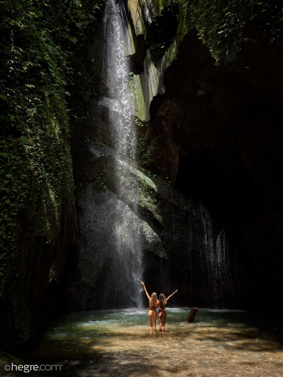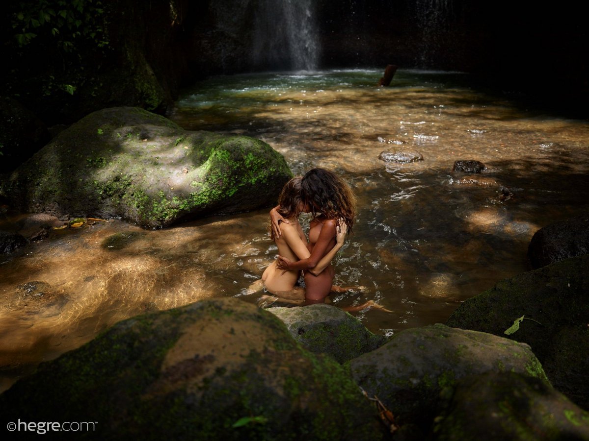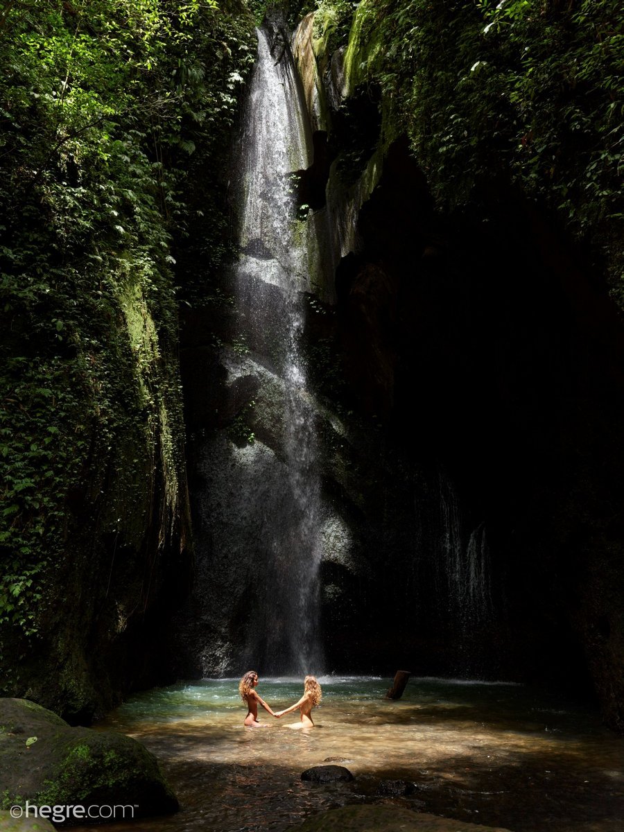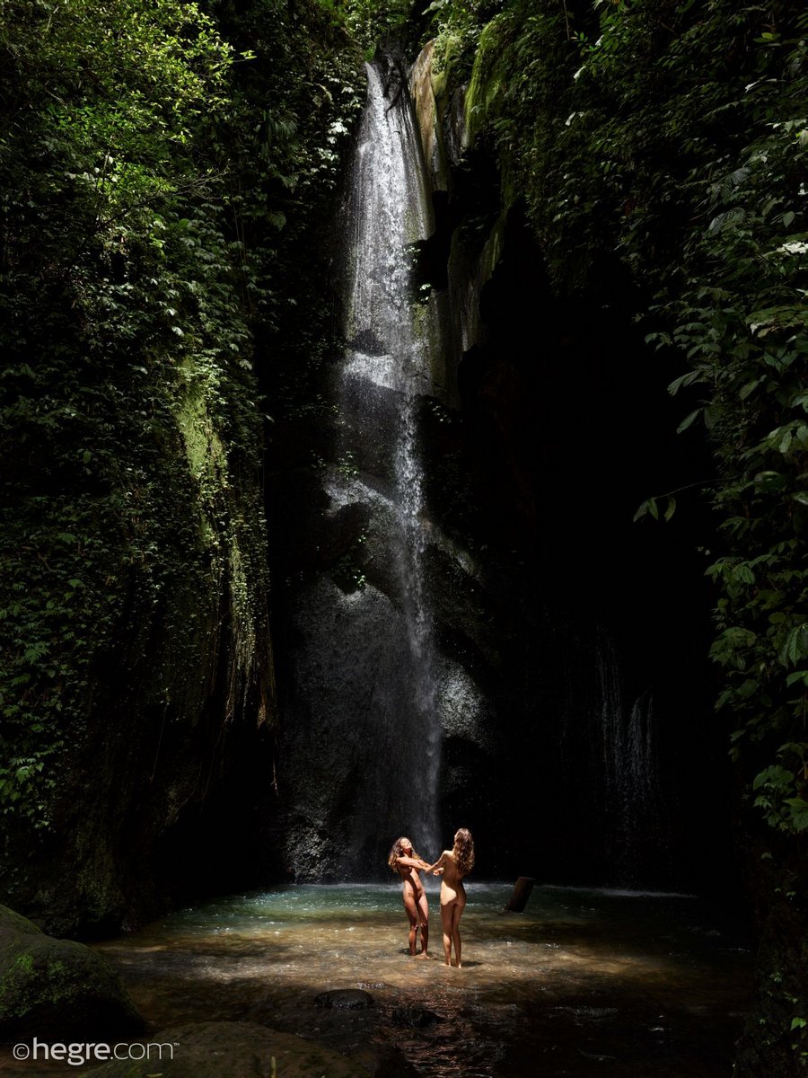 Lesbian Hegre Art models Princess Clover & Putri Cinta naked and wet under Bali waterfall