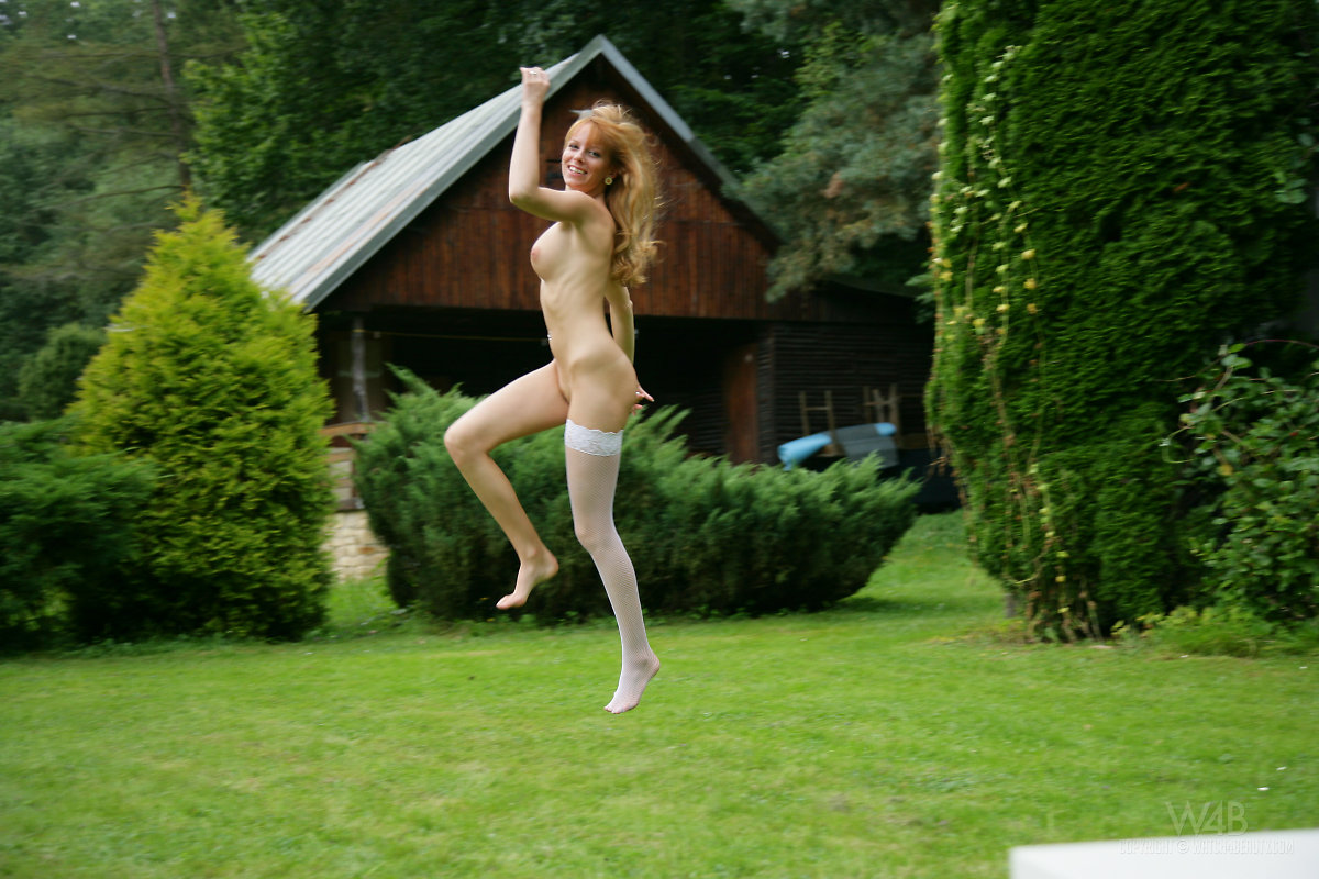 Busty Watch4Beauty model Carmen Kees from Czech Republic posing nude outdoors in stockings in Garden