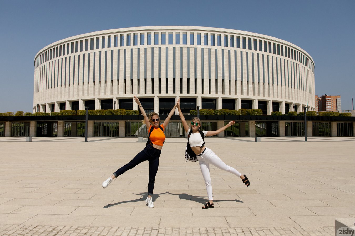 Teen Zishy models Diana Sedova and Victoria Minina flashing nude tits in public in Krasnodar, Russia at 2018 World Cup Football stadium in World Cups