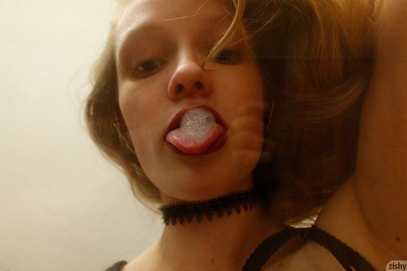 Blonde Zishy model Giana Van Patten in lingerie and boots flashes nude boobs in Black Coke Mirror