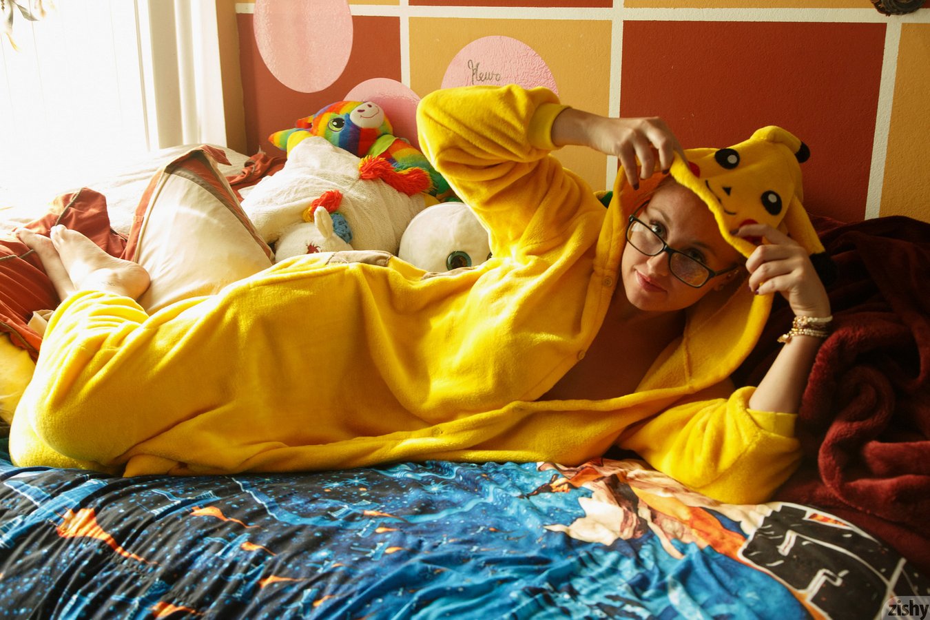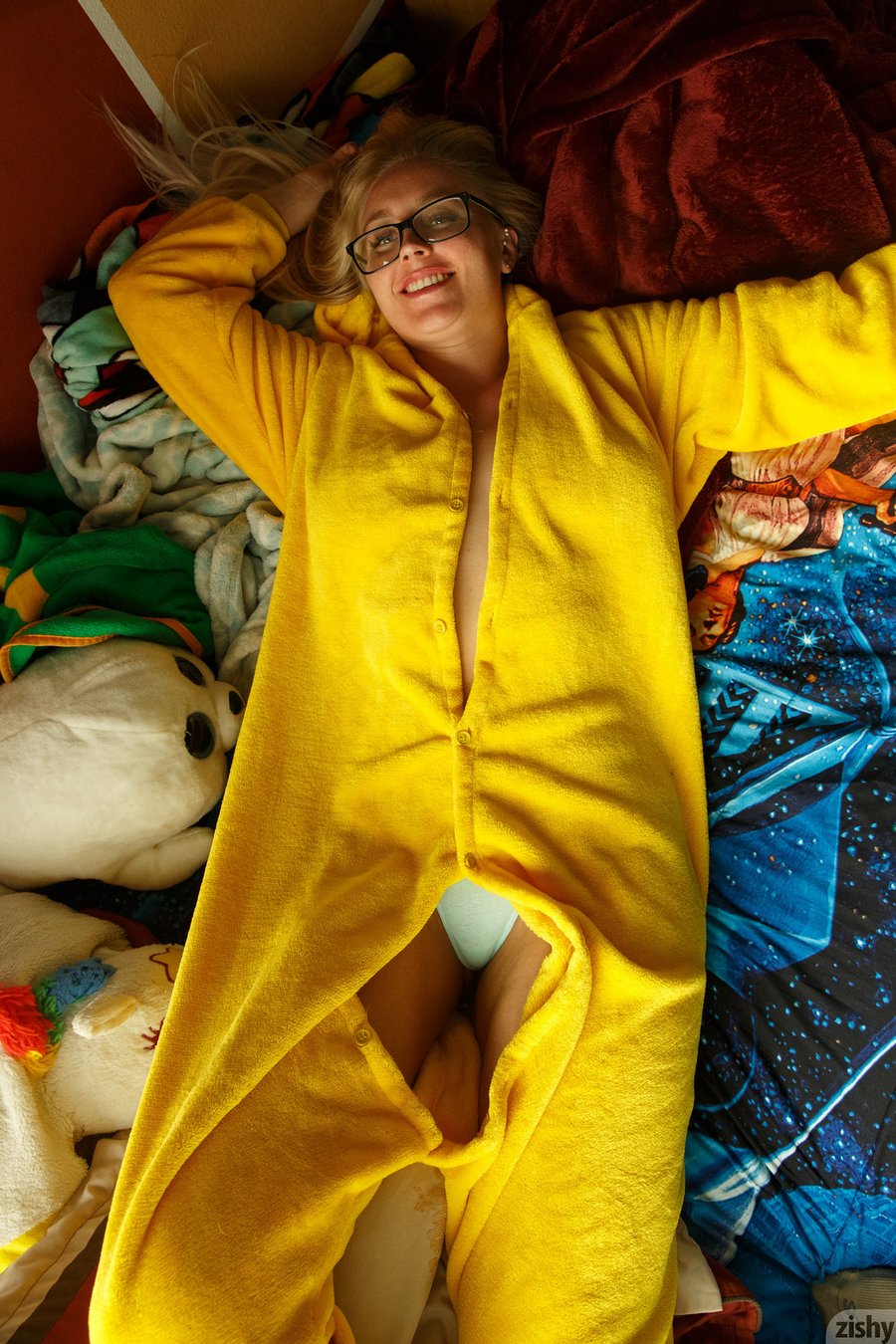 Blonde PAWG model Zishy Harley Woodburn in Pokemon Pikachu onesie goes naked in I Pikachoose You