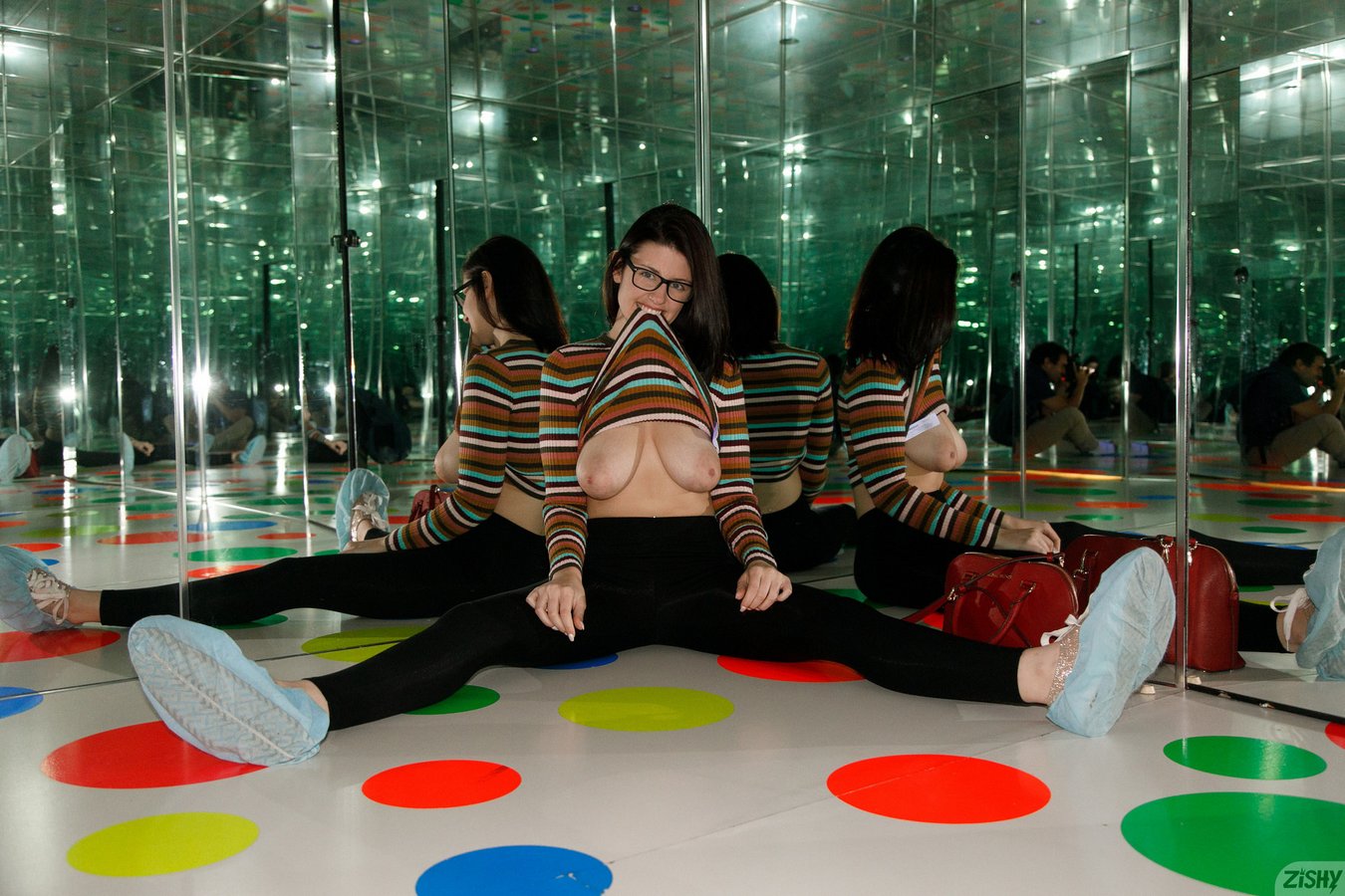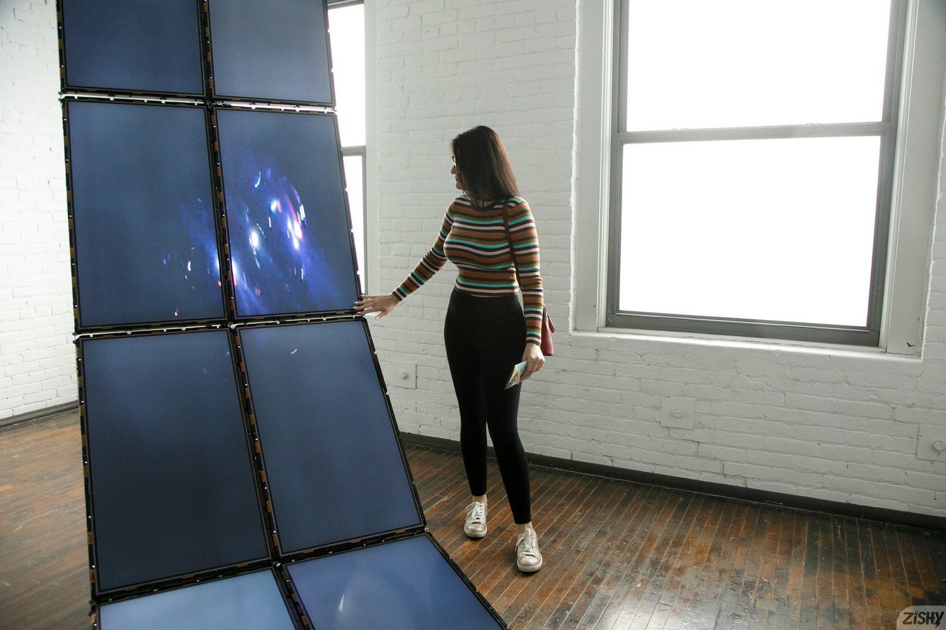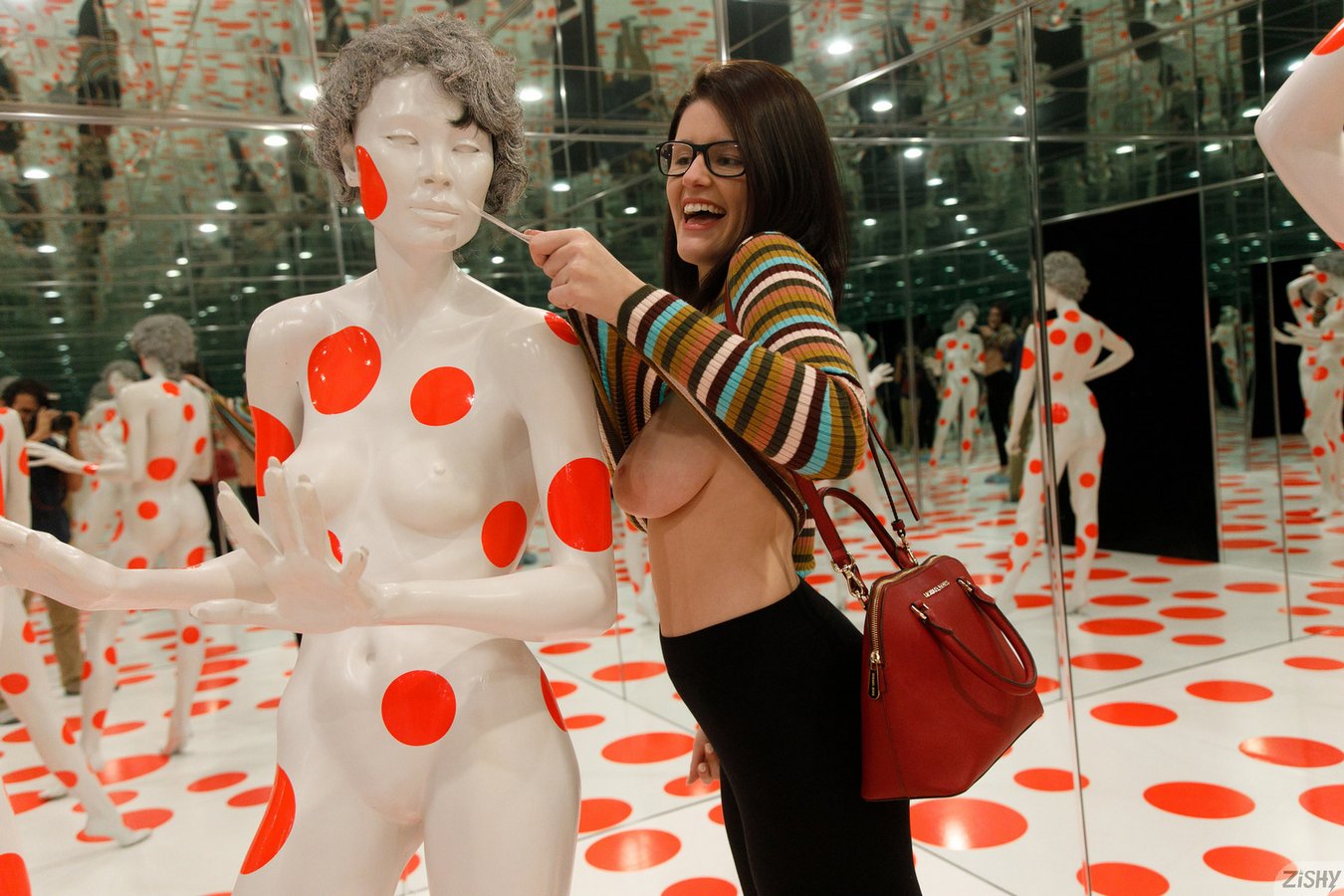 New busty Zishy model Michele James in yoga pants flashing her nude body in public at Mattress Factory in Pittsburgh in Who Arted