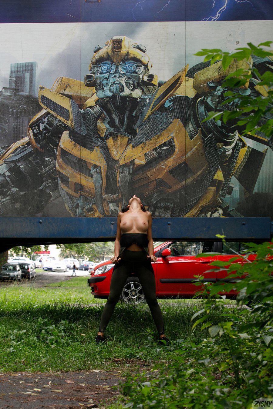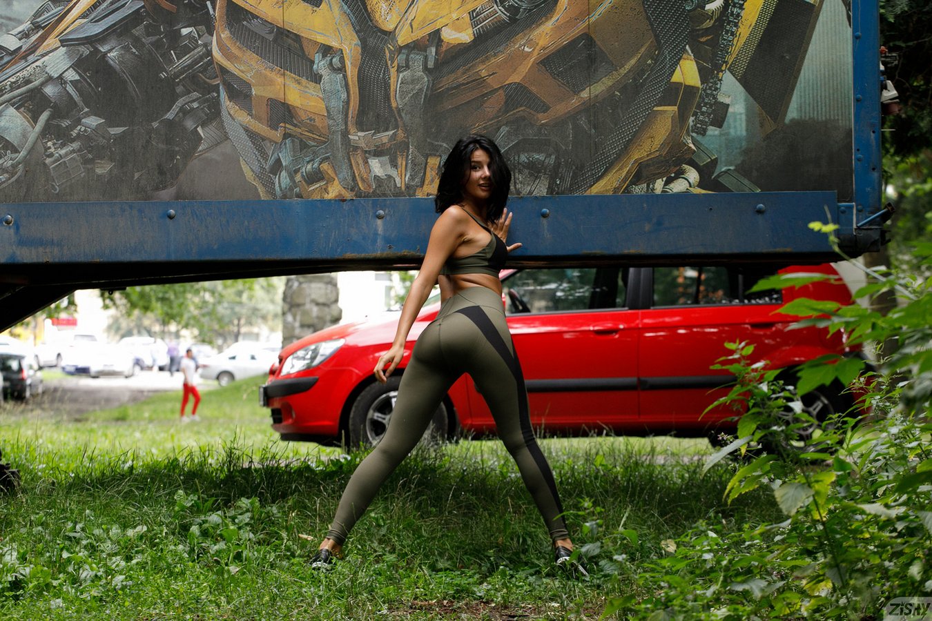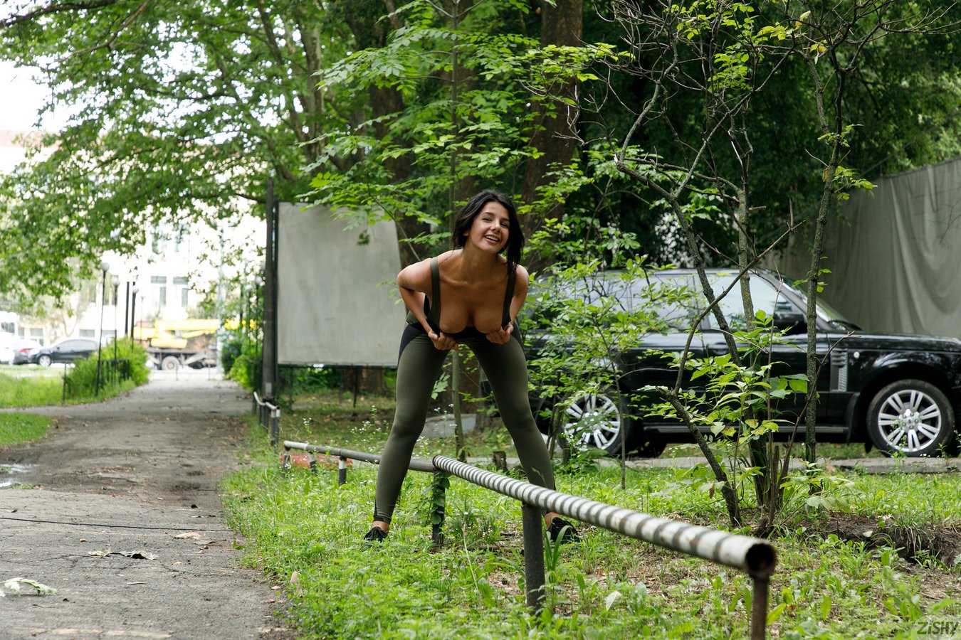 Busty Zishy model Nadia Serbinenko aka Sofie Lilith in yoga pants flashing her naked body in public in Runnin From Squitos