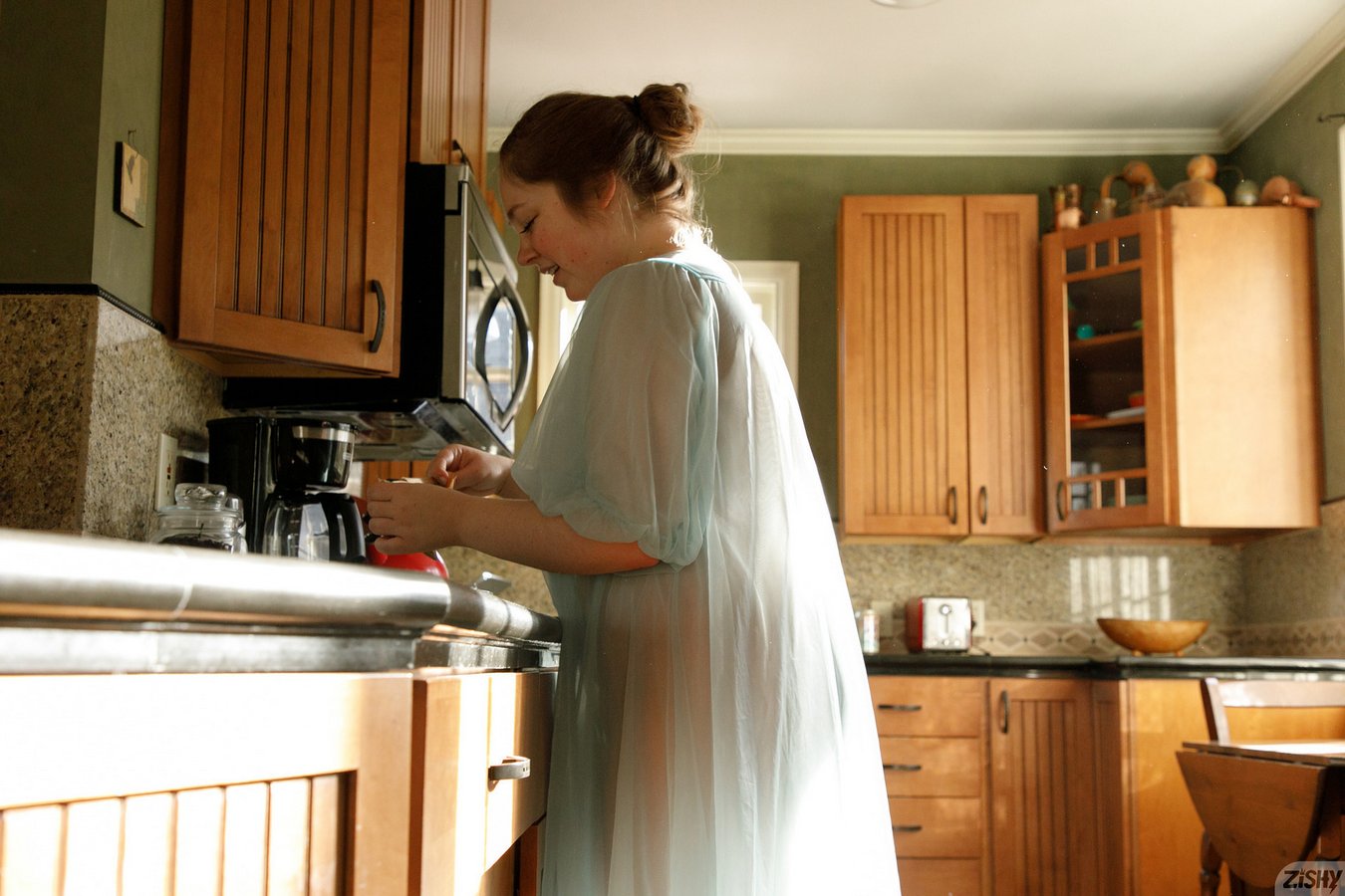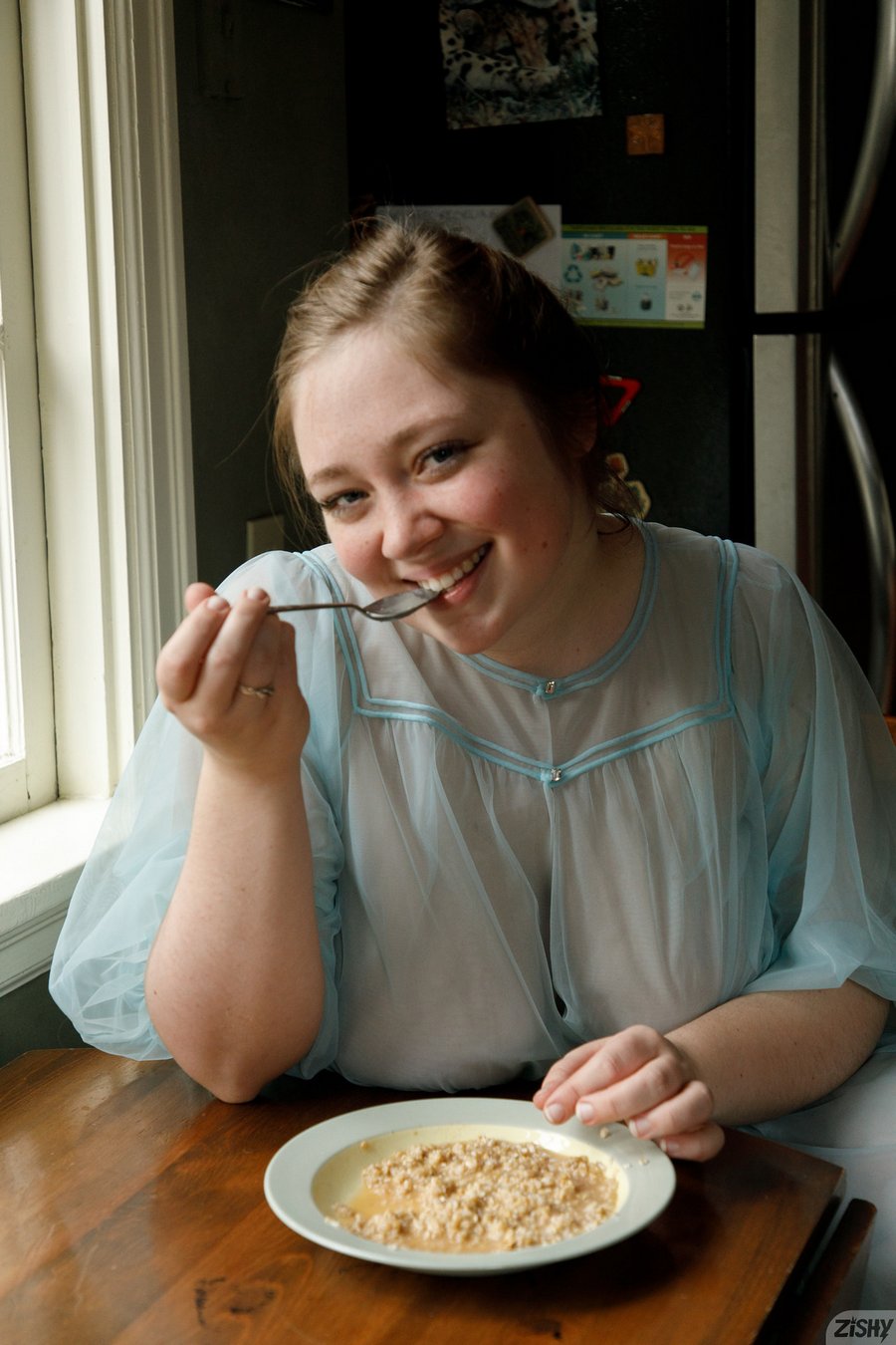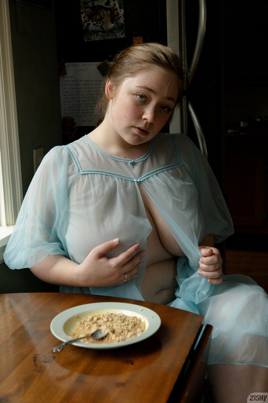Curvy Zishy model Rose Fessenden in sheer nightgown goes naked in Instant Oatmeal