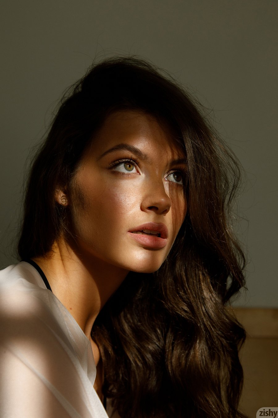 Tall brunette Zishy model Shyla Volbeck in sheer lingerie goes naked in Bedside Manners